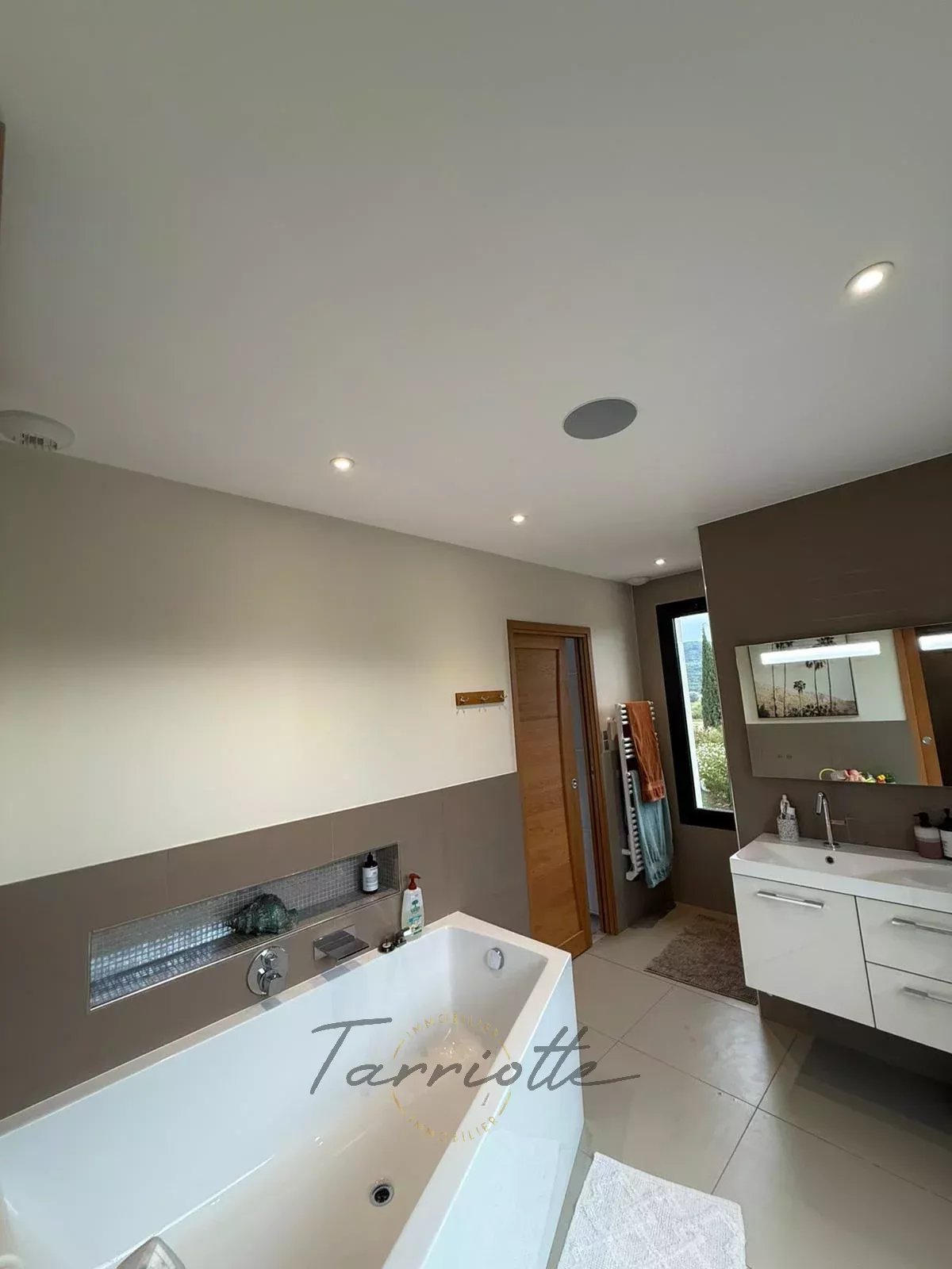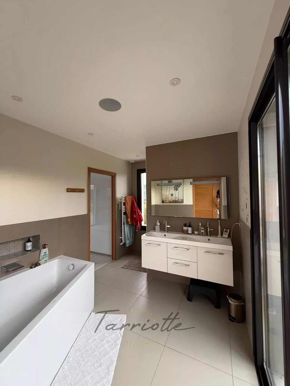 1 Chambre de maître 18 m²Accès terrasse de toit privative. Salle de bain de 7.50 m² équipée d’une baignoire, douche, wc et vasque sur meuble