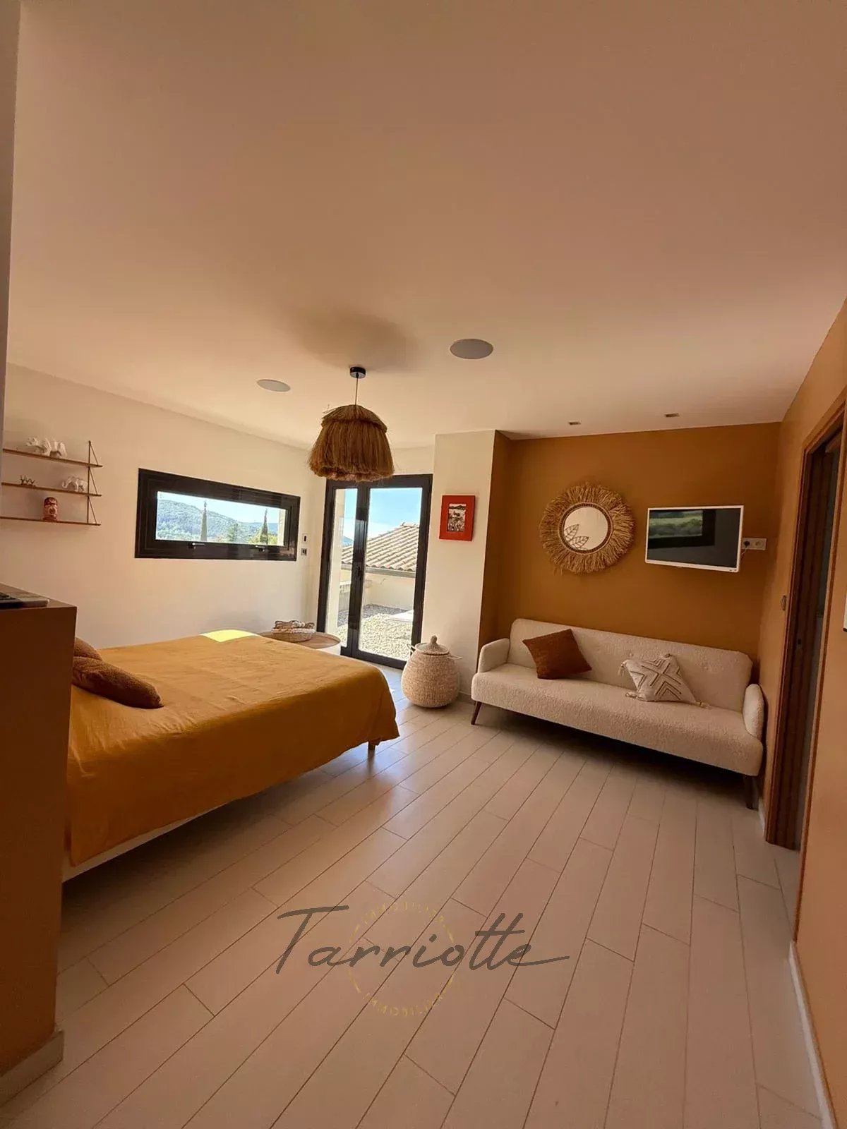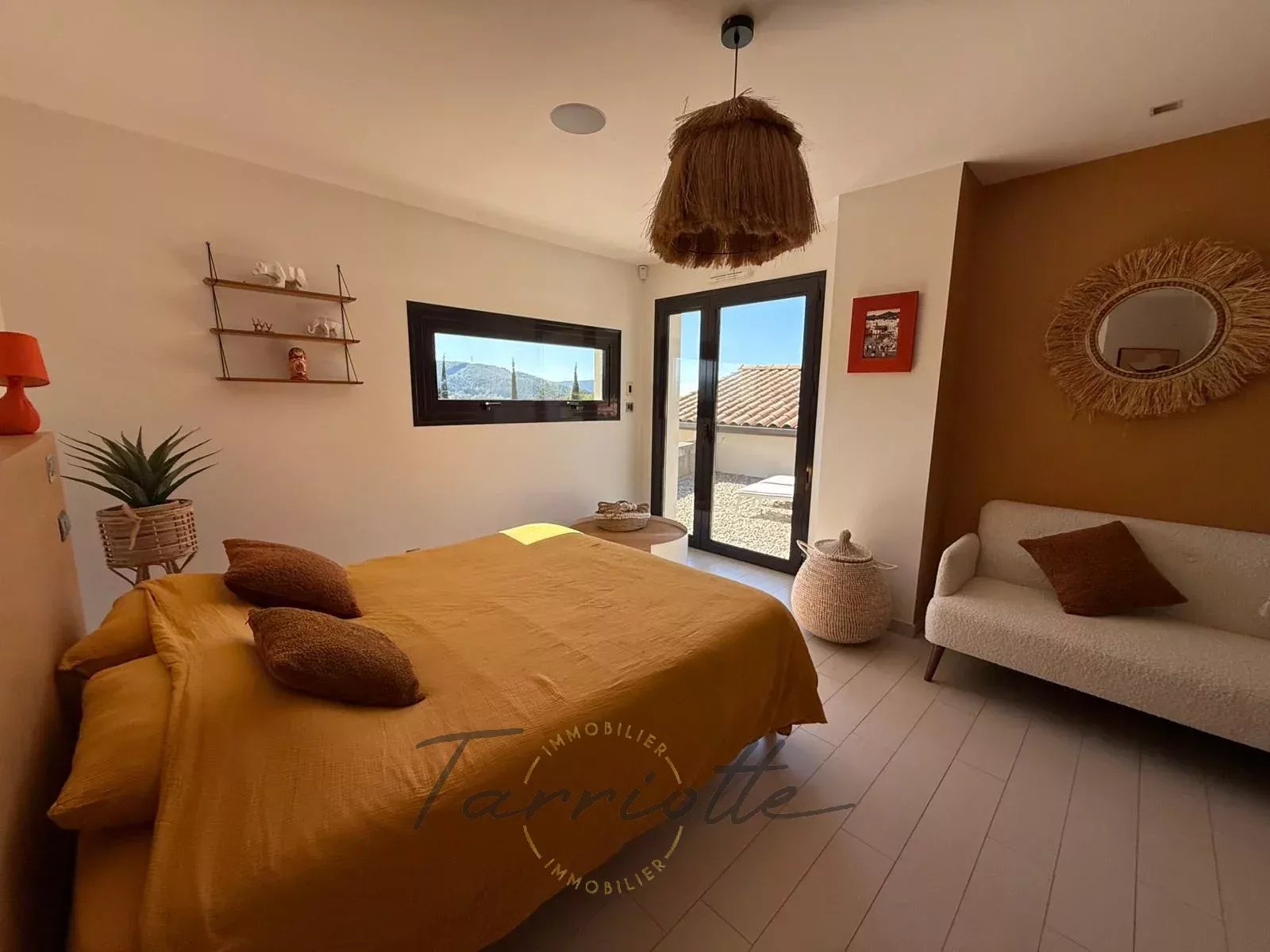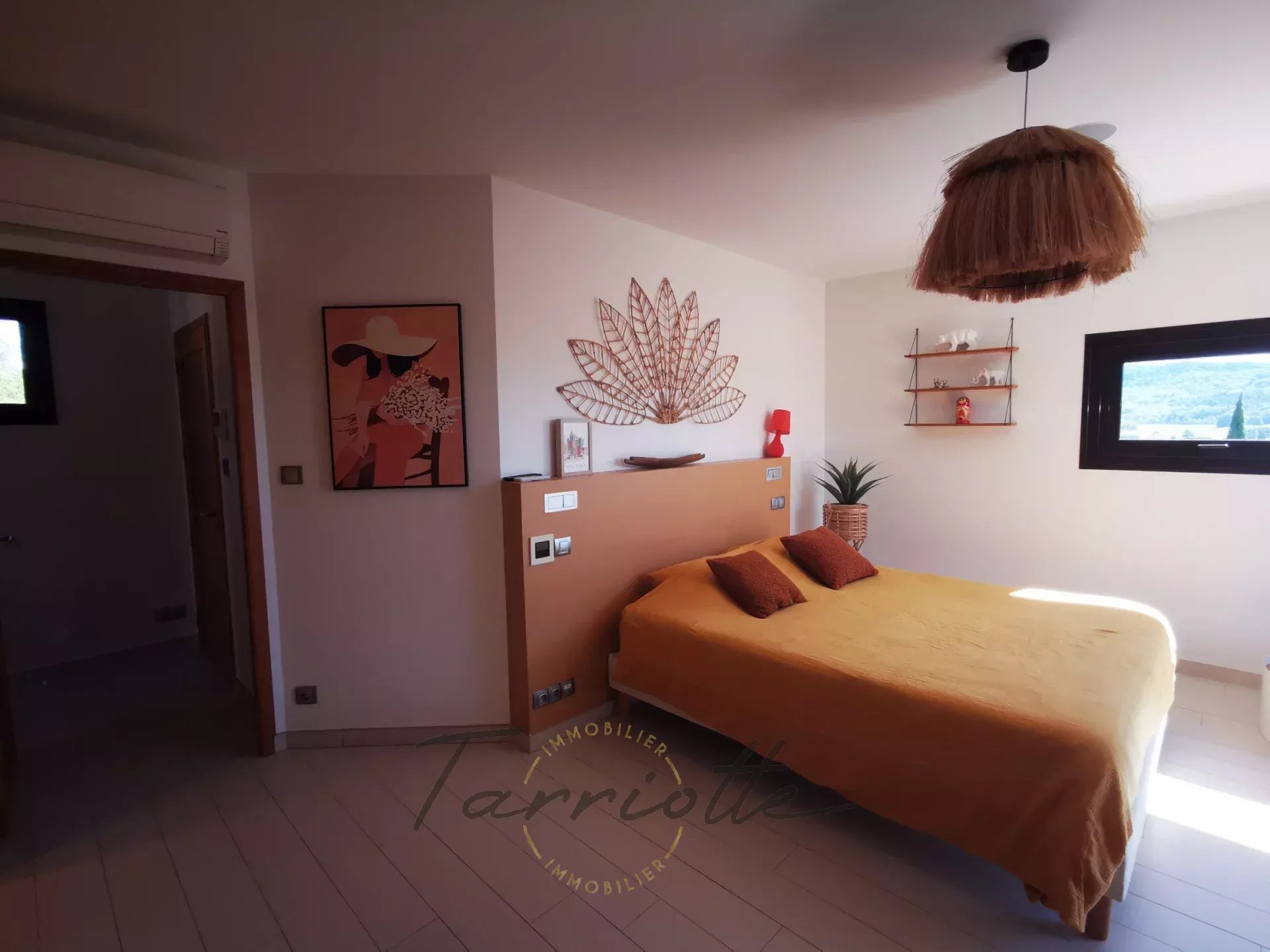 1 Chambre 14 m²Placard sur mesure, baie vitrée sur terrasse Est, salle de douche avec wc.